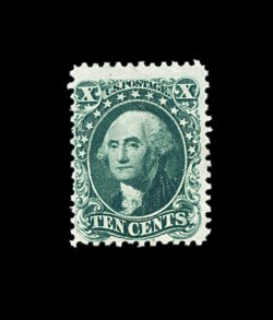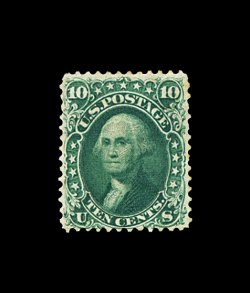 56 og 62B image#62B, 10c Dark green "August", an uncommonly select mint example of this truly rare and challenging stamp, featuring sumptuously rich color and a razor-sharp impression, while centered just a bit to bottom, this stamp possesses far better centering than usual, full o.g., very fine; a choice copy of a stamp that is terribly difficult to find both sound and still retaining its original gum; 1998 PF certificate. (Image) 7,250.00