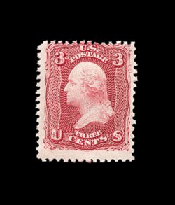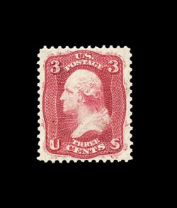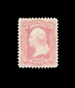 57 ng 64 image#64, 3c Pink, a magnificently centered unused example of this very rare and often misidentified stamp, possessing absolutely perfect centering amid uncharacteristically large margins, and just as impressive is this stamp's spectacularly bright and unmistakable pink color, with a strong impression to match on wonderfully fresh paper, fully intact and even perforations all around, extremely fine; a gem unused 1861 Three Cent Pink for the finest collection; 1999 PF certificate. (Image) 3,750.00