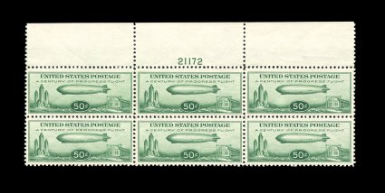 581 nhPB C18 image#C18, 50c Graf Zeppelin, full top margin plate no. 21172 block of six, strong fresh color, well centered, o.g., n.h., very fine. (Image) 725.00