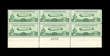 582 ogPB C18 image#C18, 50c Graf Zeppelin, bottom margin plate no. 21172 block of six, rich color, o.g., top middle stamp l.h., other stamps n.h., fine-very fine. (Image) 525.00