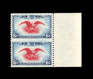 584 nh C23a image#C23a, 6c Dark blue and carmine, imperforate horizontally, right sheet-margin vertical pair, pencil notations on reverse indicate positions 31/36, unusually well centered, exceptionally fresh colors, o.g., n.h. (trivial gum wrinkle in top stamp), choice very fine; signed Kessler. (Image) for hinged 325.00