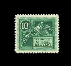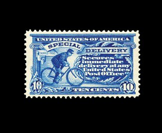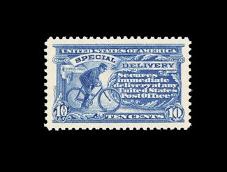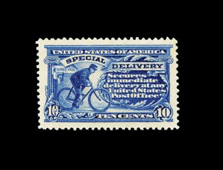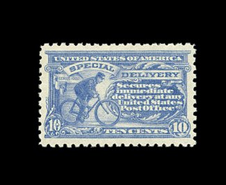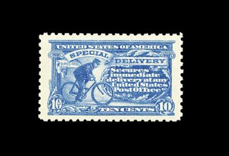 585 og E1 image#E1, 10c Blue, gem mint single, being beautifully centered within four large margins, bright color, sharp impression on exceptionally bright white paper, o.g. very lightly hinged, extremely fine; 1992 PF certificate (never hinged by omission). (Image) 400.00