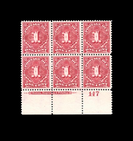595 nhPB J38 var. image#J38 var., 1c Claret, an incredibly fresh and choice full bottom margin imprint and plate no. 147 block of six, in the distinctive claret shade, with a razor-sharp impression on pristine paper, quite well centered, strong intact perforations, o.g., n.h., very fine; the first premium quality plate block of this postage due we have ever seen; 2003 PF certificate. (Image) for hinged 250.00+