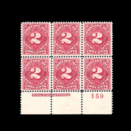 596 nhPB J39 var. image#J39 var., 2c Claret, gem full bottom margin imprint and plate no. 159 block of six, in a distinctive claret shade, "post office" fresh, razor-sharp impression on immaculate paper, exceptionally well centered, strong and intact perforations, pristine o.g., n.h., extremely fine; we have not seen this scarce plate block's condition equal; 2003 PF certificate. (Image) for hinged 250.00+