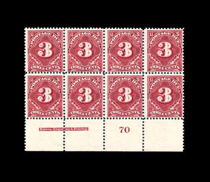 597 nhPB J40 image#J40, 3c Deep claret, pristine full bottom margin imprint and plate no. 70 block of eight, incredibly intense color and impression, strong intact perforations, nicely centered, immaculate o.g., n.h., very fine for this seldom seen postage due plate block; 2003 PF certificate. (Image) 1,290.00