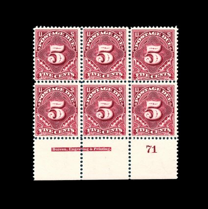 599 nhPB J41 image#J41, 5c Deep claret, full bottom margin imprint and plate no. 71 block of six, incredibly fresh and intact, sumptuously rich color and a deeply incised impression on pristine paper, well centered, immaculate o.g., n.h., very fine; a marvelously choice example of this truly rare plate block; 2003 PF certificate. (Image) 1,050.00