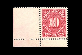 600 nh J42 var. image#J42 var., 10c Carmine, a spectacular bottom left corner sheet margin example of this scarce and distinctive shade variety, being in a condition that is unlikely rivaled by any other, flawlessly centered amid extravagantly large margins, gorgeous prooflike color and impression, pristine o.g., n.h., a superb gem for the finest collection of postage dues; 2003 PF certificate. (Image) 160.00