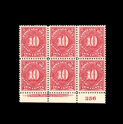 602 nhPB J42 var. image#J42 var., 10c Carmine, incredibly choice bottom margin imprint and plate no. 256 block of six, being in a true "post office" fresh state, featuring gloriously rich color in a distinctive carmine shade, with a prooflike impression on immaculate paper, extraordinarily well centered, pristine o.g., n.h., extremely fine; quite likely the finest quality #J42 plate number block extant; 2003 PF certificate. (Image) 1,050.00+