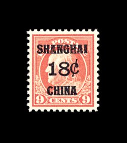 607 nh K9 image#K9, 18c on 9c Salmon red, an absolutely pristine example of this pretty stamp, perfectly centered within large margins and most attractively surrounded by crisp even perforations, "post office" fresh o.g. n.h., extremely fine gem; 1993 PF certificate for a block of nine, this being the center stamp. (Image) 140.00