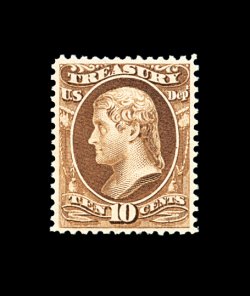 616 og O111 image#O111, 10c Treasury, on soft porous paper, unusually well centered, fresh color, full o.g., lightly hinged, extremely fine; 1997 PSE certificate. (Image) 180.00