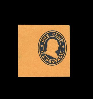 689 og W22 image#W22, 1c Blue on orange wrapper, star die, fresh mint cut square, measuring a nicely balanced 36x35mm, deep blue on a strong horizontally laid orange paper, exceptionally strong embossing giving a highly detailed impression, extremely fine for this rare cut square of which there is believed to be only approximately ten examples known; signed R.A. Champagne and accompanied by a 2002 PF certificate. (Image) 4,000.00