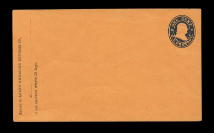 692 ogc U23 image#U23, 1c Blue on orange, star die, die 12A, size 7, knife 24, wmk. 1, attractive mint entire on deep orange paper, "American Express Co." printed return corner card at left, fresh and crisp except for trivial edge nick above imprint, still very fine; ex-Barkhausen (UPSS #43). (Image) 1,000.00