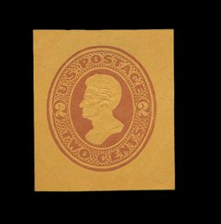 762 og U140A image#U140A, 2c Reddish brown on orange, mint cut square measuring 32x37mm, insignificant and faint corner bend at bottom right, mentioned for strict accuracy, very fine; this cut square over the years has been confused with its Two Cent Vermilion counterpart also on orange paper (Scott #U145) and in many cases the two have been certified by the Philatelic Foundation as one and the same, as evidenced by the accompanying 1960 certificate submitted by the Raymond H. Weill Co. identifying and certifying this as #U145, this is clearly the red brown shade and this famous cut square has been sold and identified in major auctions (including the Lilly Sale in 1967-68 and our "Michigan" Collection sale in June of 1998) as the so-called red brown shade of Scott #U145 (now #U140A); an immense cut square rarity of which only three or four examples are known, also two entires of different sizes are known of this; 1960 PF certificate as #U145; ex-Barkhausen, Lilly, "Michigan" Collection and Floyd. (Image) 25,000.00