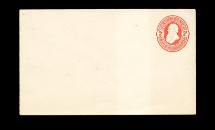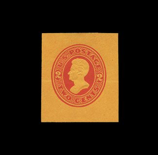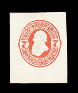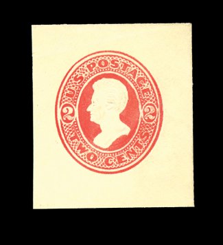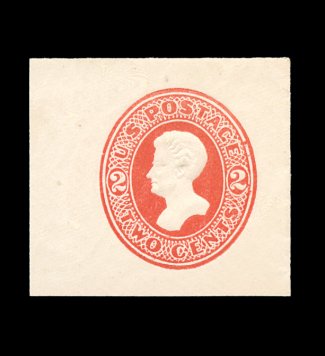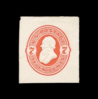 763 og U145 image#U145, 2c Vermilion on orange, mint cut square, measuring 35x40mm, a wonderfully attractive appearing example of this major cut square rarity, brilliant vermilion color on bright orange paper, highly detailed sharp embossing, light horizontal crease that is barely perceptible from the face, extremely fine appearance; like the #U140A offered above there has been confusion between the vermilion and reddish brown colors, it is a pleasure to be able to offer the two colors in the same sale so that the drastic difference can be seen; this is also an immense cut square rarity as only three cut squares are believed to exist and, unlike the other color variety, there are no known entires, it is our experience that the vermilion color is, by far, the more elusive of the two, the first example that we ever handled of this was a slightly smaller copy in the Fred C. Ballman collection of cut squares offered in our October 2002 Collector's Series sale (that copy also had a trivial light corner bend) where it realized a record $57,500.00, plus the 10% buyers premium; ex-Lilly. (Image) 50,000.00