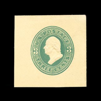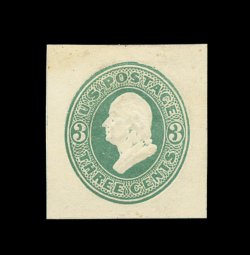769 og U168 image#U168, 3c Green on white, mint cut square of this scarce die, 33x35mm, strong embossing and bright paper, very fine and attractive. (Image) 1,500.00