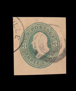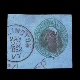 771 O U170 image#U170, 3c Green on blue, used cut square of this very rare issue with impressive appearance, measuring 48x40mm, cancelled with large portion of "Burlington/VT./Mar 20 1882" duplex, tiny closed tear at top just into the frame, very fine appearance; this issue is a major postal stationery rarity in mint condition and also very rare in used, this being one of the more attractive of the few that are known. (Image) 3,750.00