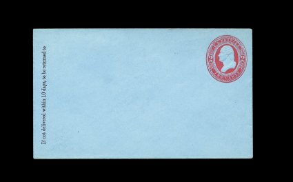 806 ogc U245 image#U245, 2c Red on blue, 2 links, die 77, size 7, knife 31, wmk. 6, attractive mint entire with the scarce die showing 2 links below the right "2", the only envelope that comes in this die on blue paper, printed return message at left very fine and choice (UPSS #747). (Image) 625.00