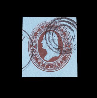 820 O U275 image#U275, 2c Brown on blue, round "O" in "TWO", an unusually handsome used example of this exceptionally rare cut square, measuring 32x35mm, possessing a clean target cancel with dots in the center, detailed stamp impression on bright blue paper, very fine; this is one of the most elusive postal stationery items with no mint entires or cut squares known, only seven used cut squares have been recorded, the example here being one of the most attractive; signed R.A. Champagne; ex-Wampler. (Image) 20,000.00