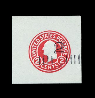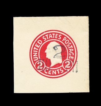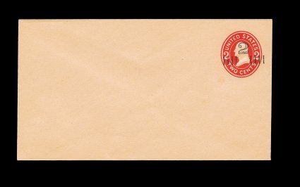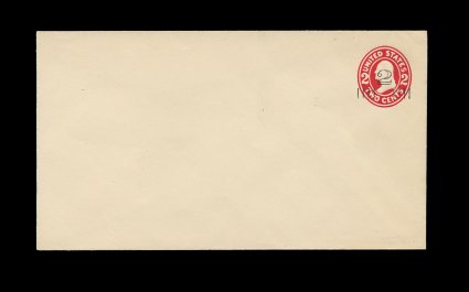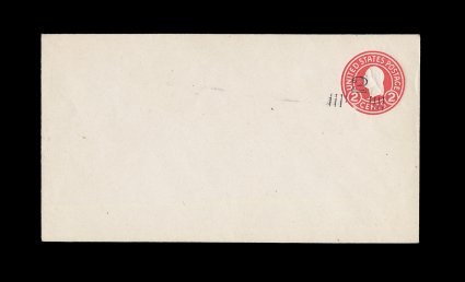880 ogc U466Ae image#U466Ae, 2c on 2c Carmine on white, die 7, UPSS die 140, size 10, knife 57, wmk. 22, fresh and attractive mint entire, with strong surcharge which is not always the case on this rare envelope, very fine and choice; only 24 are thought to have been printed; signed White; ex-Wunsch (UPSS #2940). (Image) 1,750.00