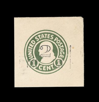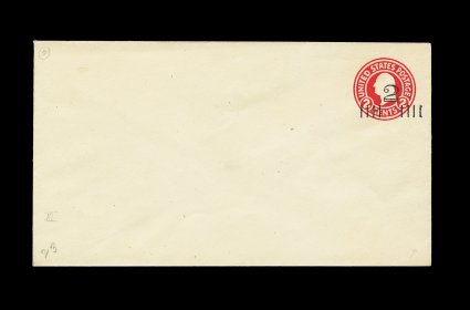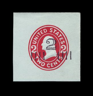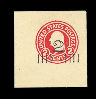 861 ogc U453a image#U453a, 2c on 2c Carmine on white, die 1 type 3 surcharge, UPSS die 115, size 23, knife 106, wmk. 18, mint entire that has been reduced at left and refolded, this extremely rare envelope only comes in this size and it is believed that less than five examples exist, bright color and clear well positioned surcharge, attractive despite the reduction and would yield a gem extremely fine full corner cut square which is a rarity in its own right (UPSS #2811). (Image) 8,000.00