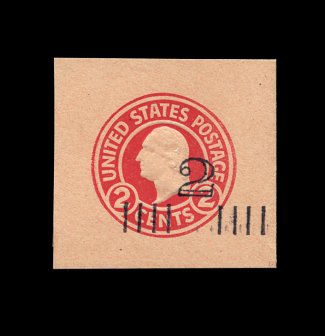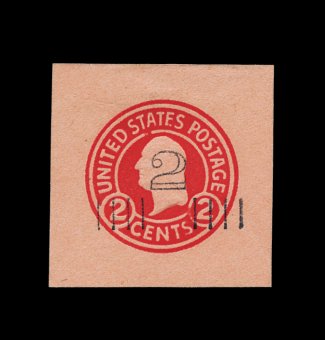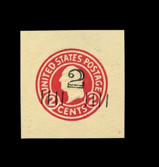 867 ogc U455 image#U455, 2c on 2c Carmine on amber, die 1, type 3 surcharge, UPSS die 134(A), size 13, knife 80, wmk. 22, mint entire, fresh and clean, a very fine and choice example of this rare entire; it is believed that only 33 examples of this entire were found; signed J.M. Bartels; ex-Barkhausen (UPSS #2831). (Image) 3,750.00