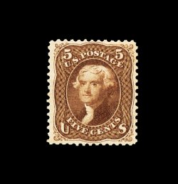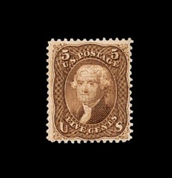 83 og 95 image#95, 5c Brown, "F" grill, brilliantly fresh and choice mint example, possessing a marvelous overall mint "bloom", with especially deep and luxuriant color, plus its impression is much stronger than usual, quite well centered within uncharacteristically large margins, full clean o.g. that has been only lightly hinged, very fine; a handsome original gum example of the Five Cent "F" Grill; 1989 PF certificate. (Image) 3,500.00
