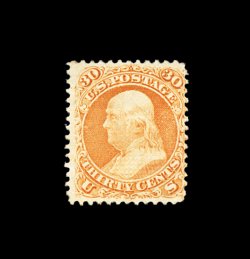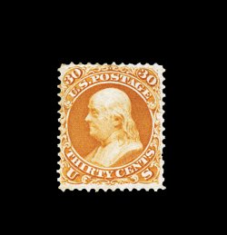 86 og 100 image#100, 30c Orange, "F" grill, handsome mint example of this rarity, possessing far better centering than normally encountered, plus its margins are quite wide, strong vibrant color, full o.g. which is slightly disturbed, tiny corner crease at top left, otherwise a very fine example of a stamp that is almost always missing in even the most advanced mint U.S. collections; 1999 PF certificate. (Image) 7,000.00