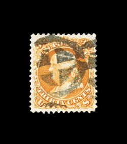87 O 100 image#100, 30c Orange, "F" grill, a spectacular quality used example that is easily one of the very finest used Thirty Cent "F" grills extant, as this remarkable stamp is not only free of the flaws usually associated with this value, but its margins and centering are beyond compare, being incredibly well centered amid huge margins that are never encountered, even its color is far more deep and luxuriant than usual on bright fresh paper, choice strike of fancy geometric postmark in a small circle, extremely fine; a marvelous used gem for the finest collection; the Scott catalog states "Values for No. 100 are for copies with small margins, especially at sides. Large-margined examples sell for much more"; 2001 PF certificate. (Image) 800.00