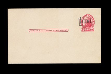 1000 ogc UX31 image#UX31, "1 cent" surcharge on 2c Red on cream, a choice mint example of the so-called "one line surcharge" rarity, crisp and fresh, both sides clean and nice sharp corners, extremely fine; this surcharge was used experimentally in Washington, D.C. and was deemed unsatisfactory being immediately withdrawn, making this one of the scarcest and most desired postal cards (UPSS #43). (Image) 5,000.00