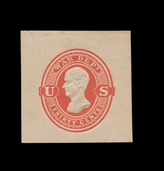 987 ogc UO68 image#UO68, 30c Red War Dept. on amber, die WD17, size 21, knife 98, wmk. 2, scarce mint entire in the smaller of the two sizes in which this comes, quite fresh with bright color on pale amber paper, detailed embossing, very fine and a very difficult entire; 2000 PF certificate; ex-Henderson, White (UPSS #WD136). (Image) 2,400.00
