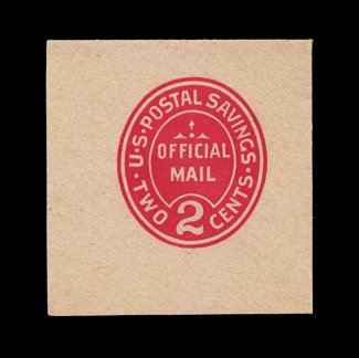 989 og UO72a image#UO72a, 2c Carmine Official Mail, printed in error on manila instead of white, select and rare mint cut square of this terribly elusive item, full corner measuring 46x47mm, indicia with bright red color and the paper in the characteristic manila color, extremely fine; missing from even the major cut square collections; 1987 PF certificate. (Image) 1,750.00