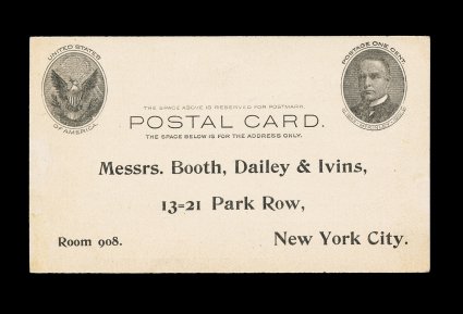 999 ngc UX17 image#UX17, 1c Black, "Full Face" McKinley, unused as usual with preprinted garbage tug form on the reverse and printed address on the front, couple very minor corner bends and tiny abrasion at left from hinge, both barely noticeable, otherwise a very fine example of this popular and rare postal card of which only 149 cards were preserved of the original 500 cards printed (UPSS #S21). (Image) 3,250.00