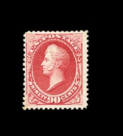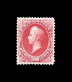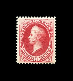 142 og 155 image#155, 90c Carmine, marvelously fresh and crisp mint example of this rare Bank Note high value, exceptionally rich color and a highly detailed impression on bright paper, quite well centered, full clean o.g. that has been lightly hinged only once, very fine; a far more rare stamp mint than its 1873 Continental Bank Note counterpart; 2001 PF certificate. (Image) 4,500.00