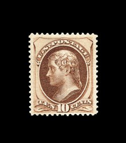 143 nh 161 image#161, 10c Brown, a magnificent quality mint example that is the epitome of a "post office" fresh gem, as this stamp possesses an amazing overall brilliance and freshness unlike any other we have encountered, with truly prooflike color and impression on immaculate paper, incredibly well centered within very large margins, pristine o.g., never hinged, extremely fine; this particular Bank Note is notoriously difficult to find mint in any condition, let alone in this incomparable never hinged state; obviously the catalog value for this stamp is of little relevance when determining its true market value; 2001 PF and PSE certificates. (Image) for hinged 950.00