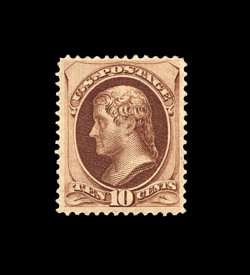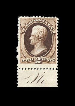 148 og 168 image#168, 2c Dark brown special printing, without gum as issued, handsome bottom sheet-margin "No." single, being one of the very few known examples that was not scissor separated (couple of nibbed perfs. at left), particularly well centered, especially when compared to most others, as this value is typically found notoriously off center, wonderfully bright and fresh, rich luxuriant color, very fine; among the better existing examples of which approximately 75 are thought to still exist; 1992 PF certificate; ex-Earl of Crawford, Lyons. (Image) 5,750.00