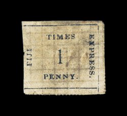 181 ng imageS.G. #1, 1870 1p Black on rose "Fiji Times Express", unused, roulettes on two sides, bit soiled, thin spot, fine appearance; an affordable example of this very scarce stamp; 1991 BPA certificate (Scott #1; $3,250.00). (Image) £3,250