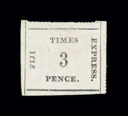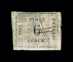 183 O imageS.G. #3, 1870 6p Black on rose "Fiji Times Express", used, showing roulettes on two sides, "#" cancel, thinned, fine appearance; 1992 BPA certificate (Scott #3; $2,750.00). (Image) £2,000