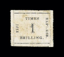 184 ng imageS.G. #4, 1870 1/- Black on rose "Fiji Times Express", unused, with full roulettes all around (a most unusual occurrence on the Fiji Times stamps), small faults as usual, very fine appearance; 1991 BPA certificate (Scott #5; $1,700.00). (Image) £1,500