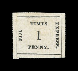 185 og imageS.G. #5, 1871 1p Black on rose "Fiji Times Express", a choice mint example of this scarce stamp, showing large portions of the roulette lines on all four sides, especially fresh, full o.g., mild h.r., extremely fine; truly rare in this premium quality; 1990 BPA certificate (Scott #6; $950.00). (Image) £900