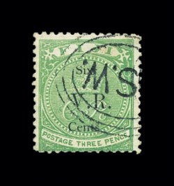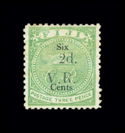 189 ng imageS.G. #25, 1875 Black "2d" on "Six Cents" surcharge on 3p Green with Roman "V.R.", attractively centered unused example of the scarcest of the normal Two Pence surcharges, only 2,862 were believed to have been issued and most of these were used, small faults, very fine appearance; 1989 BPA certificate (Scott #27; $1,700.00). (Image) £1,700