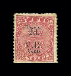 190 og imageS.G. #27, 1875 "2d" on "Twelve Cents" surcharge on 6p Rose with Roman "V.R.", rich color, o.g., h.r., perfs. trimmed at bottom, fine; a rare stamp, especially with original gum; 1992 BPA certificate (Scott #31; $1,100.00). (Image) £1,900