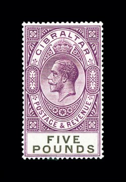 195 og imageS.G. #108, 1925 £5 Violet and black, well centered, strong rich color, o.g., lightly hinged, very fine; a handsome example of this key popular high value (Scott #93; $1,750.00). (Image) £1,300