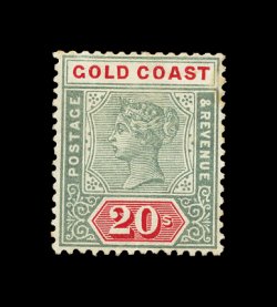 199 og imageS.G. #24, 1889 20/- Green and red, the rare key value of this country, a mint single that is quite well centered with perforations clear of the design all around, colors are deep and rich except for a tiny spot at top right where slight perf. toning has been lightened, otherwise o.g., very fine; this stamp was withdrawn in 1893 because of a theft of 1,440 stamps and the value in new colors was issued, 950 stamps from the theft were recovered and destroyed, thus this stamp is of exceptional rarity in mint condition; 1990 BPA certificate (Scott #24; $3,250.00). (Image) £3,250