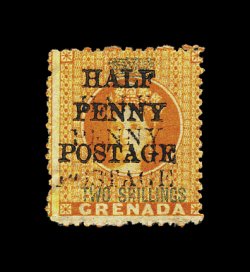 205 og imageS.G. #43a, 1889 "Half/Penny/Postage" provisional surcharge on 2/- Orange revenue, surcharge double, bright fresh color, o.g., small gum stain not visible on face, fine; clear 1989 BPA certificate (Scott #31a; $400.00). (Image) £300