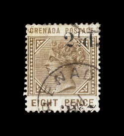 206 O image#S.G. #47d, 1891 "2 1/2" provisional surcharge on 8p Grey brown, surcharge double, one inverted, used, rich color, neat c.d.s. cancel, faint toned spot at top left, otherwise a fine example of this scarce error; 1989 Brandon certificate (Scott #38g; $450.00). (Image) £500