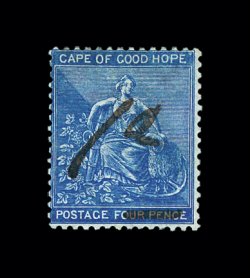 208 ng imageS.G. #1, 1874 "1d" red manuscript surcharge on 4p Blue, an unused single of this rare provisional that was produced in Kimberly when the stock of 1p Cape of Good Hope stamps ran out, stamp with deep strong color, very fine for this terribly elusive and ridiculously undercataloged issue; 1991 BPA certificate (Scott #1; $1,000.00). (Image) £1,000