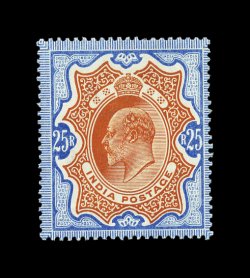 215 og imageS.G. #147, 1909 25R Brownish orange and blue, a gorgeous mint example of this scarce high value, possessing intensely vibrant colors and particularly strong impressions, well centered, full clean o.g. that has been very lightly hinged, choice very fine; 1992 BPA certificate (Scott #76; $825.00). (Image) £750