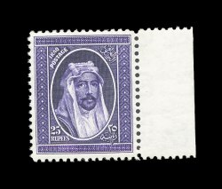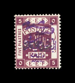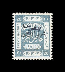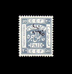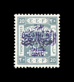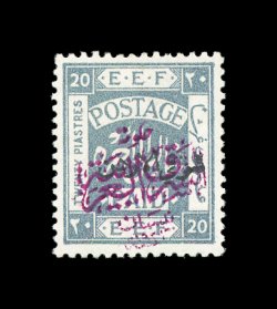 294 og imageS.G. #53, 1922 (Dec.) 20Pi Pale grey, with red purple handstamp, exceptionally well centered and margined, rich color, o.g., lightly hinged, extremely fine for this; one of the finest known examples of this rarity, of which only 57 were issued between both the red purple and violet handstamps on the 20Pi value; 1969 RPS and 2000 BPA certificates; ex-Asch, Gibralter (Scott #52A; $1,900.00). (Image) £1,600