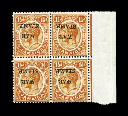 282 og/nhbl imageS.G. #74d, 1917 1 1/2p Orange, with inverted "WAR STAMP." overprint, right sheet-margin block of four, rich color, o.g., top right stamp lightly hinged, other three never hinged, light natual gum bend, fine-very fine; clear 1956 BPA certificate (Scott #MR8c; $330.00+). (Image) £320+