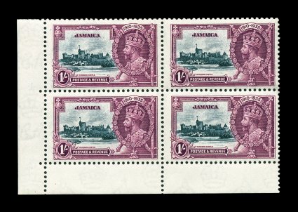 283 ogbl imageS.G. #115a, 117a, 1935 1 1/2p and 1/- Silver Jubilee, extra flagstaff, a single variety of both values contained in bottom left corner margin blocks of four, the varieties being the top left stamps, well centered, o.g., lightly hinged, very fine (Scott #110, 112 vars.). (Image) £330+
